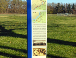pillar-shaped posts which showcase historical context, photographs, and local maps. Overhead, small